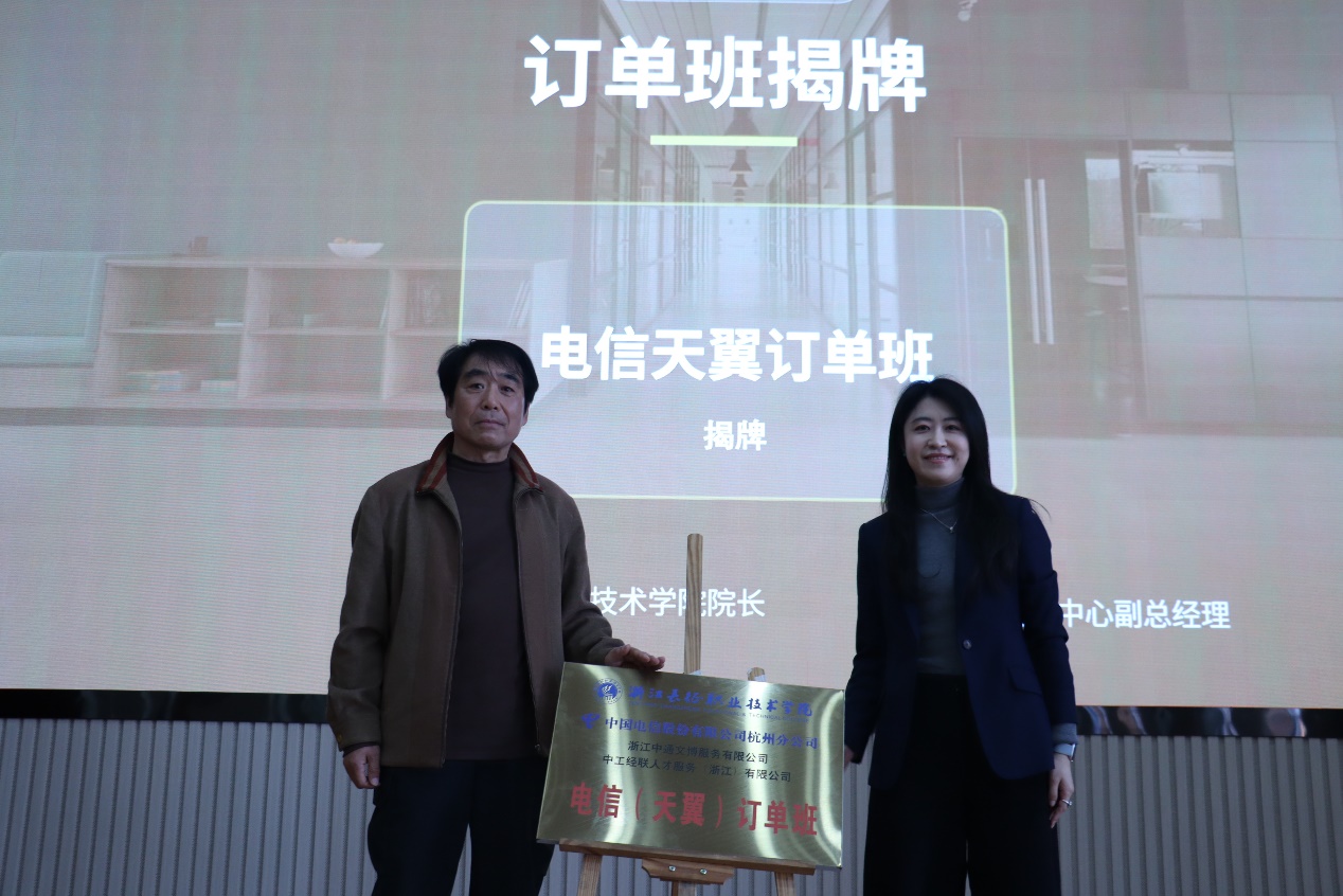 随后,授牌与揭牌仪式依次举行:张晓燕向王赟授予“浙江长征职业技术学院实习实训就业基地”牌匾;梁爽爽与梅灿华共同为“电信天翼订单班”揭牌。