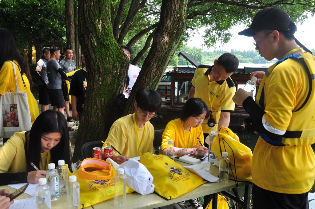 我校志愿者分为7个小组,分别是:主会场次序引导组、裁判组、检录组、机动组、引导和召集进场组、后勤组、沿线志愿者组。主会场次序引导组的志愿者负责维持开幕仪式和表演期间岸边的秩序。裁判组的志愿者负责辅助公羊会的裁判记录、报备和核对分数。检录组的志愿者是在水上浮台工作的,主要是保证参赛人员救生衣穿戴正确,等待参赛结束的龙舟,帮助参赛人员安全上下龙舟。机动组的志愿者负责救生衣的收集和发放工作。引导和召集进场组的志愿者负责赛前寻找所有参赛队伍,并且引导至参赛地点。后勤组志愿者辅助公羊会负责人为所有参赛队伍和志愿者发放午餐,引导参赛人员寄存物品。沿线志愿者负责在湖边维持观众观看比赛秩序,提醒观众远离危险水域以及指引主会场位置的工作。